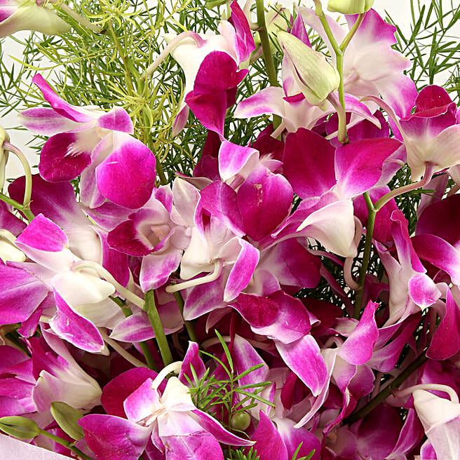 - What’s Included – 10 Purple Orchids, Green Color Delhi Asparagus fillers, Pink Non Woven Paper, White Non Woven Paper, Tied with Pink Ribbon