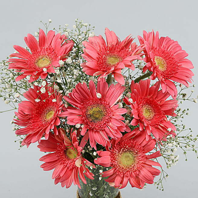 - What’s Included – 8 Pink Gerberas, White Gypsophila Gypsy Flower fillers, Decorated with a natural jute paper, Tied with a Pink Raffia yarn